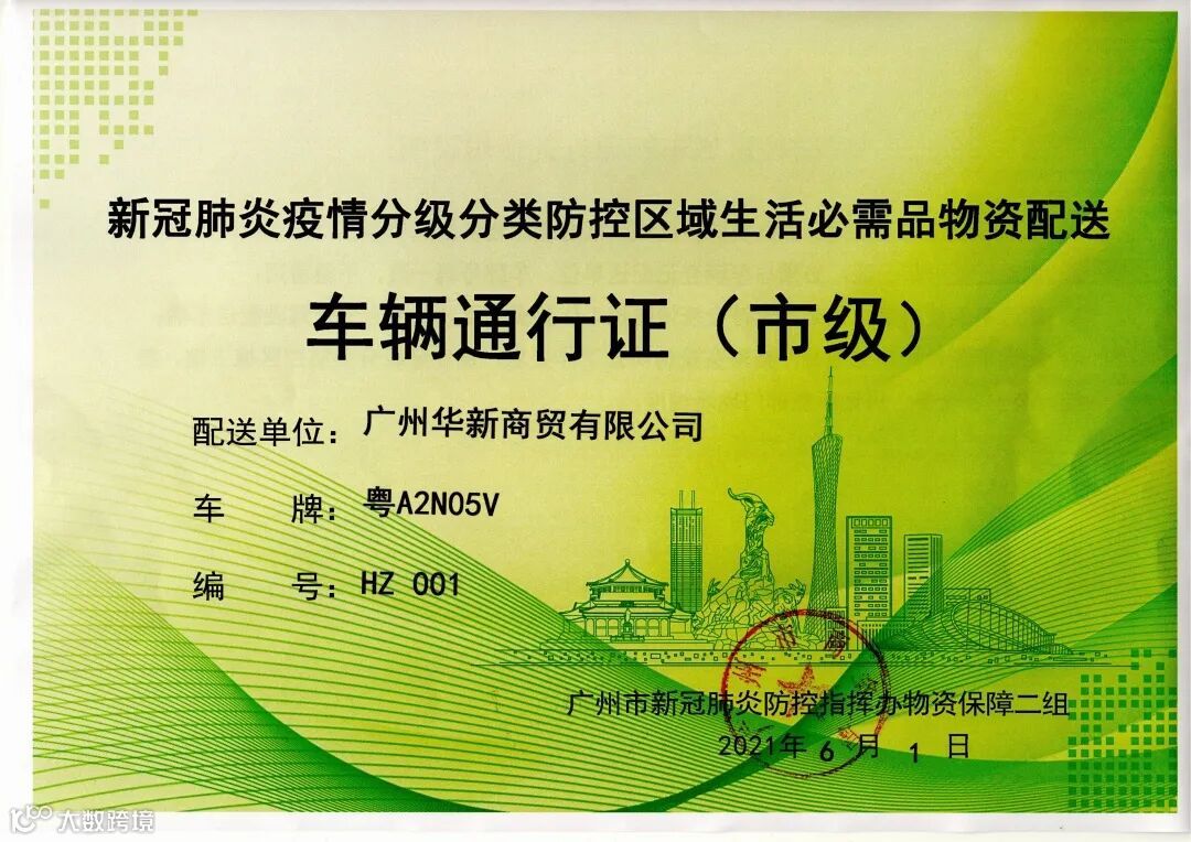面对运量庞大、运力紧张、天气恶劣等多重困难,广州华新商贸有限公司作为全国物流行业领军企业之一,抗疫救急、响应迅速,顺利完成市区各级公安、卫健局、疾控中心、医疗机构、核酸检测采集点、疫苗接种点等诸地的物资采购及配送任务,于5月28日、31日紧急调配物流车辆24台,向海珠区辖内20多个疫情防控点配送5000多箱饮料、食品等保障物资;于5月30日向海珠区街道办捐赠宝矿力、怡宝等饮用水700箱。凭借过硬的物流实力,广州华新商贸有限公司于6月1日获颁首张市级新冠肺炎疫情分级分类防控区域生活必需品物资配送车辆通行证(编号:HZ001),全力保障疫情防控区域救急物资的供应运输。