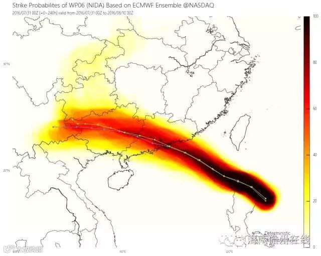 最新的欧洲数值集合预报路径图显示,妮妲已锁定广东,最可能登陆珠三角。图上颜色越深,台风登陆的可能性越大。nasdaq根据欧洲数值数据制作