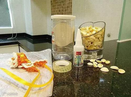准备好果仁壳、塑料瓶、502胶水、保鲜袋、透明胶、花边(依据个人爱好选择)、丝带。