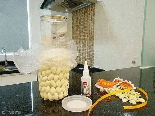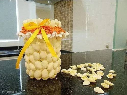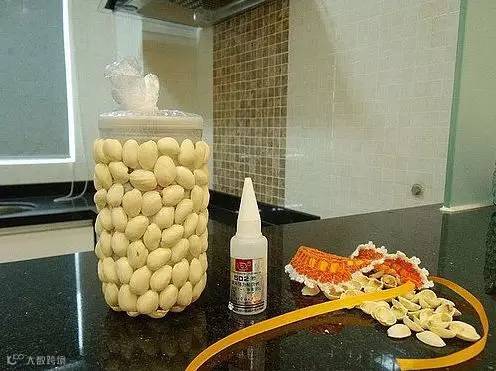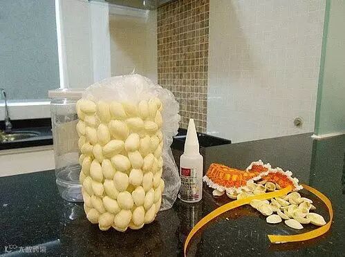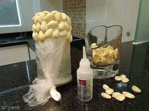 然后从瓶底开始,选大小相近的果仁壳(这样成品才平衡喔)挨个拼好,在拼接处粘上胶水。