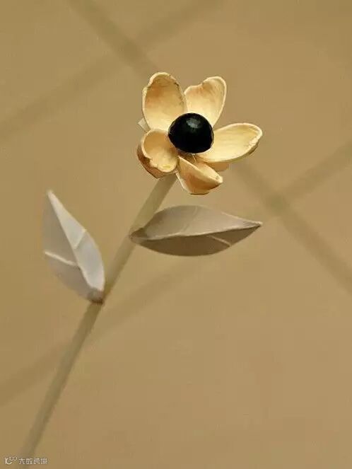 在花枝上间隔地粘几片纸叶子,一根开心果壳小花就做好了,多做几根配在一起才更加好看。