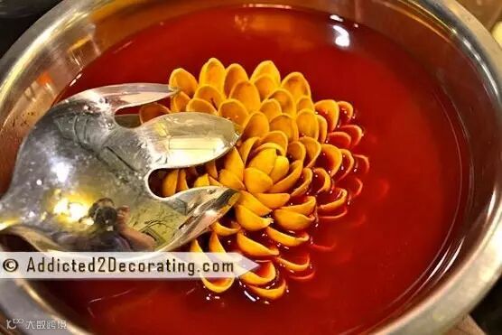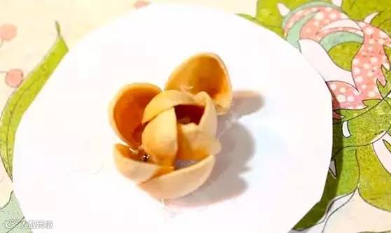 用热熔胶在果壳背面涂少许胶。(如果没有热熔胶,也可用普通胶水代替,只要别让花瓣过早掉下就可以咯!)