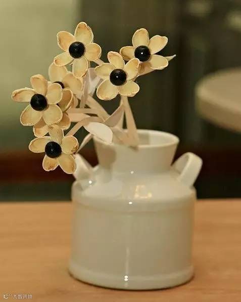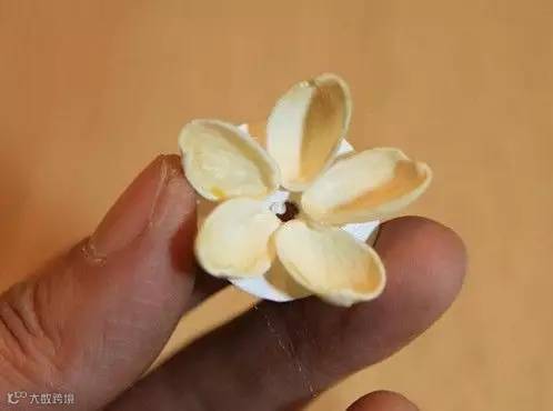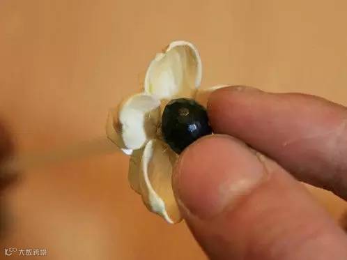 在开心果壳围成的中心位置粘一颗黑色珠扣,作为花心。如果身边一下在找不到这种黑色珠扣,可以把干桂圆的核切掉一半代替。