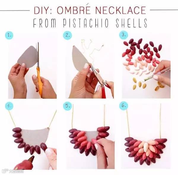 用之前说的染色方法染好色,打孔,有美感地穿起来。很随性的开心果项链,特别有艺术感。