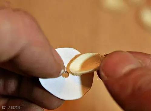一次一片压一片的将5个果壳都黏在圆纸片上。