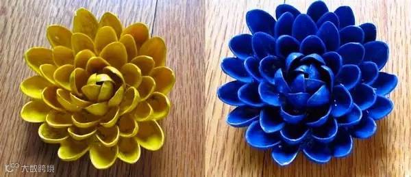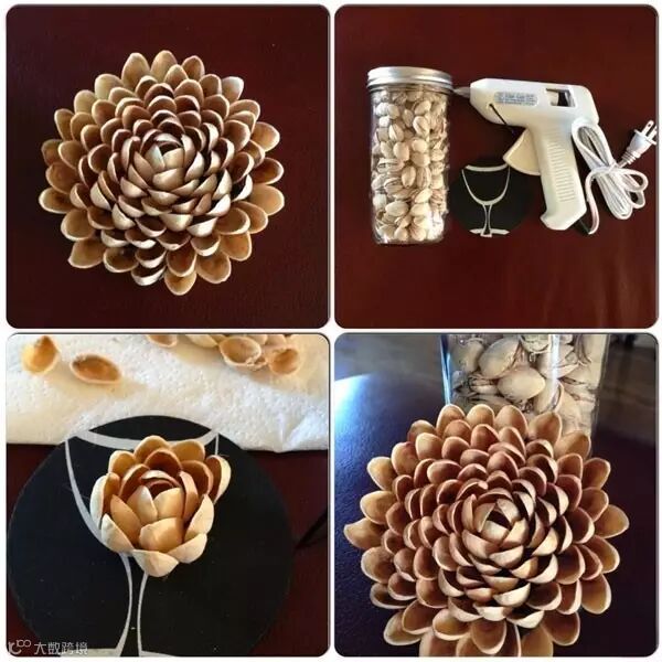 在圆形底盘中心挤上胶,把果壳一个压一个粘在一起,就有了花心。外圈花瓣一个一个粘就好了。注意第二圈的花瓣要和第一圈错开一点,否则看起来会很傻。
