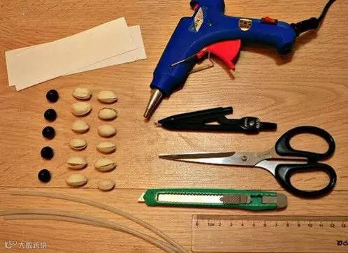 首先准备好材料和工具:开心果壳、黑色珠扣、废吸管或写完的圆珠笔芯、胶枪、白纸、圆规、剪刀。