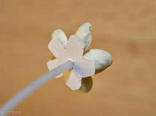 用剪刀修正圆纸,剪成梅花状。穿入废吸管或圆珠笔芯,用胶枪粘牢后成为花枝。