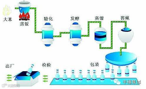 酱香型白酒的生产工艺可以概括为:两次投料,九次蒸煮,八次发酵,七次取酒,长时间贮藏,精心勾兑而成。两次投料指下沙和糙沙两次投料操作。有八次发酵、七次取酒。