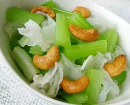 西芹营养丰富,富含蛋白质、碳水化合物、矿物质及多种维生素等营养物质,还含有芹菜油,具有降血压、镇静、健胃、利尿等疗效,是一种保健蔬菜。银耳能提高肝脏解毒能力,起保肝作用。