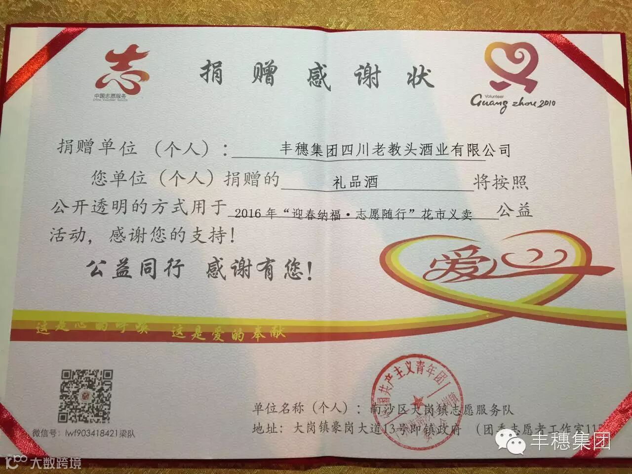 丰穗集团南沙分区,在广州市南山区大岗镇赞助了2016年南沙区大岗镇“迎春纳福• 志愿随行”花街义卖公益活动。活动中义卖所得到钱,将捐献噶大岗镇生活有困难的人民。在这次活动中我们丰穗集团还获得了南沙区政府的大力表彰。