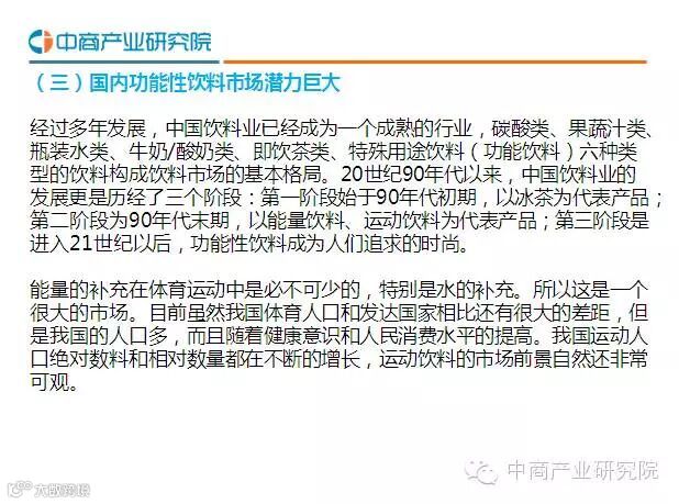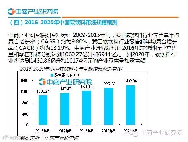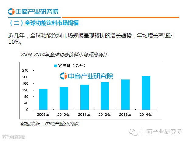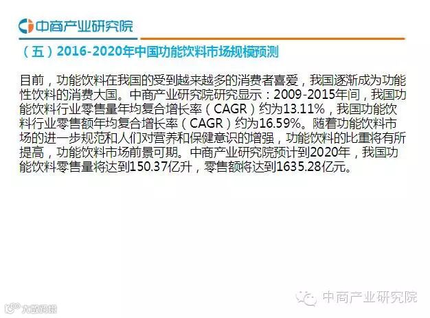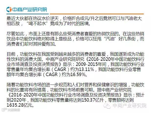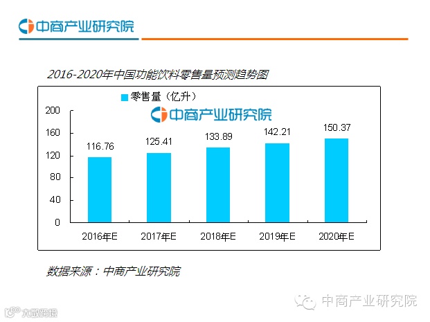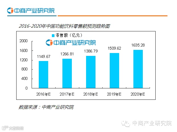 目前,功能性饮料在我国受到越来越多的消费者喜爱,我国逐渐成为功能性饮料的消费大国,中商产业研究院研究显示:2009-2015年间,我国功能饮料行业零售量年均复合增长率约为13.3%,我国功能饮料年均零售额增长率16.59%,预计到2020年,我国功能饮料零售量将达到150.37亿升,零售额将达到1635.28亿元。