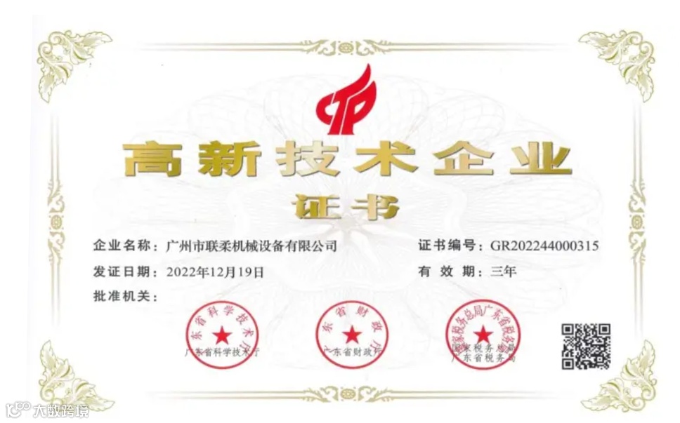 联柔机械第四次获得“高新技术企业”称号。2013年首次被认定为高新技术企业,随后2016年、2019年、2022年连续获得高新技术企业认定。公司在核心自主知识产权、科技成果转化能力、研究开发的组织管理水平、成长性等方面得到全面认可,彰显了公司综合实力。