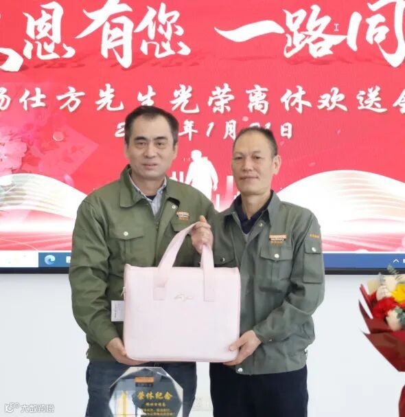 欢送会上,梁总、公司工会领导及部门负责人一同为杨工颁发荣休纪念品、慰问品及鲜花。