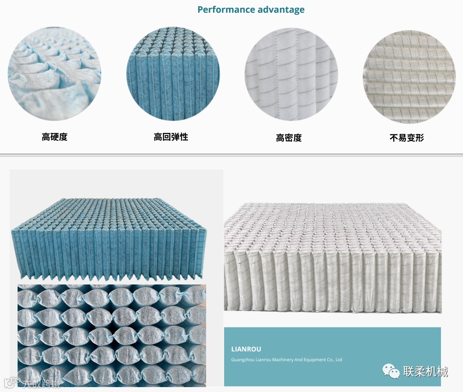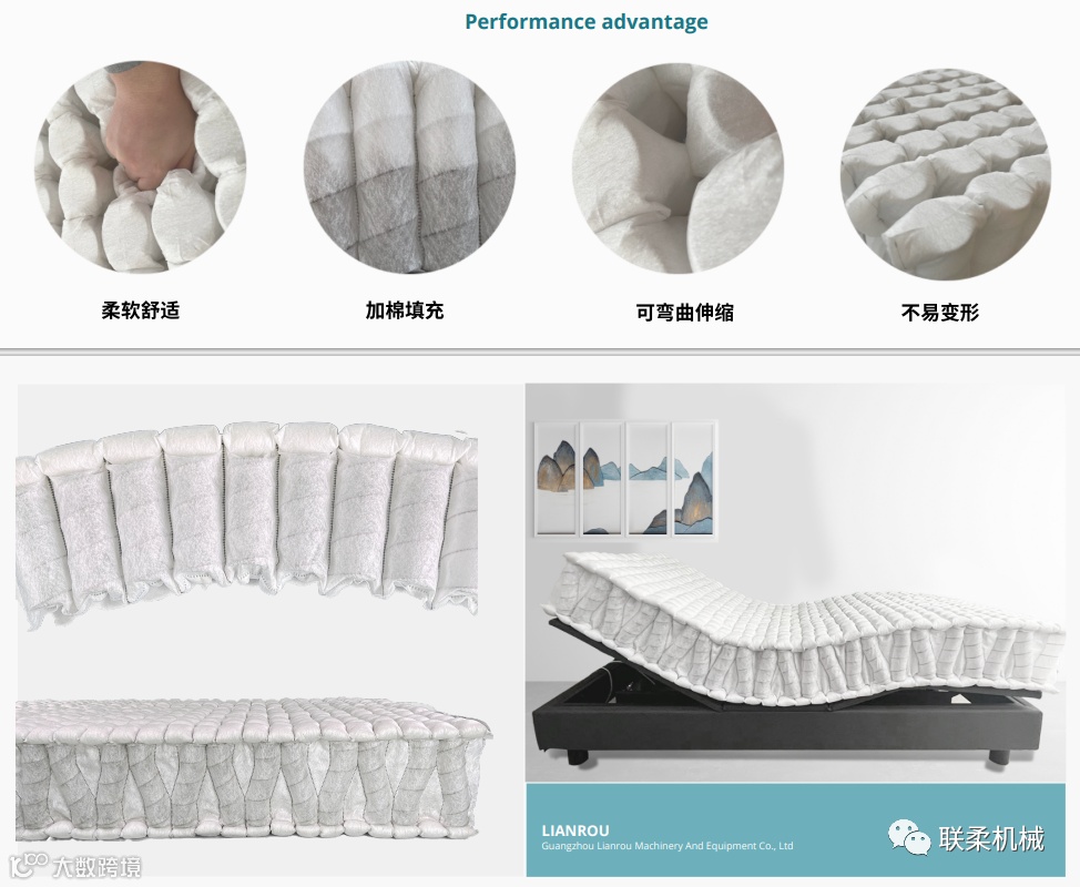 棉袋中可以填充碎海绵,碎乳胶,公仔棉大豆棉等;简化生产工序,节约人力,弹簧可以做人字型,橄榄型,V字型,C型等,预留伸缩空间,特别适用于电动床;其中人字型,C型,V型还能节约材料。