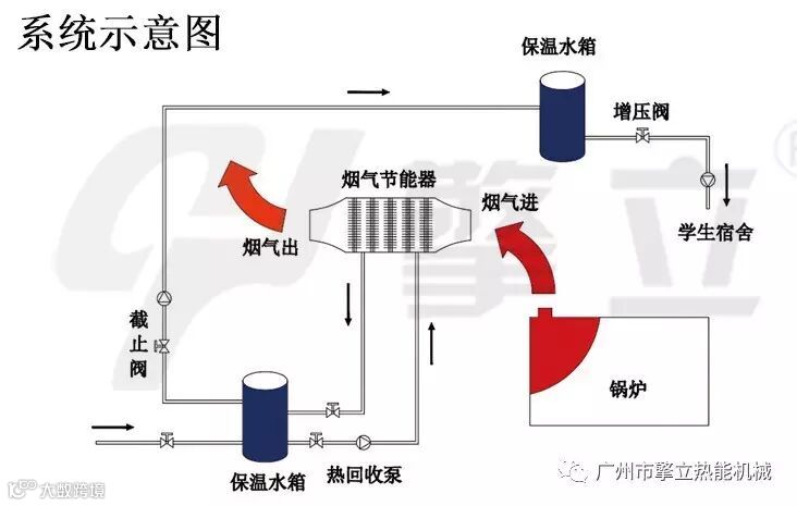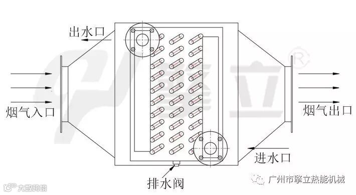 翅片管余热回收器是燃煤、油、气锅炉专用设备,安装在锅炉烟口,回收烟气余热加热生活用水或锅炉补水。其构造如图所示:左部是进气烟道,右部为出气烟道,中间管道内走水。有进水口和出水口。工作时,烟气流经翅片管余热回收器,翅片管吸热后将热量转化到水,将水加热。为了防止堵灰和腐蚀,擎立节能器有设计专门清洗口和冷凝水排口,另余热回收器出口烟气温度一般控制在露点以上,即燃油、燃煤锅炉排烟温度≮130℃,燃气锅炉排烟温度≮100℃,节约燃料4-18%。