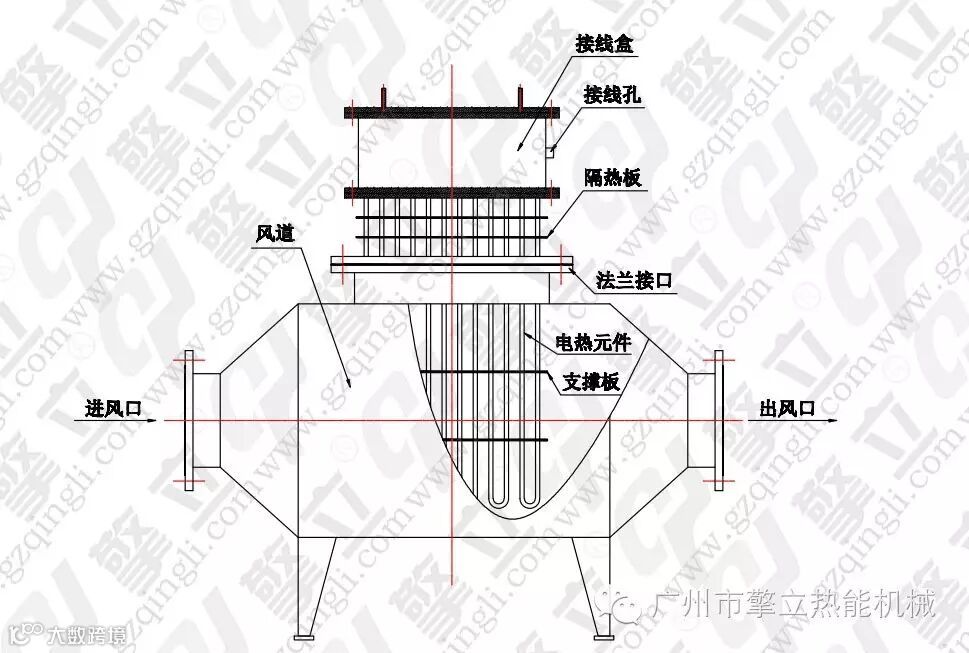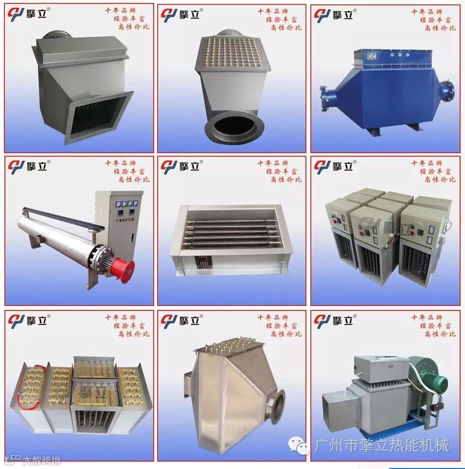 主要用于风道中的空气加热,规格分为低温、中温、高温三种形式,在结构上的共同之处是采用钢板支撑电热管以减少电热管的振动,接线盒中都装有超温控制装置。另在控制方面除装有超温保护外,还在风机与加热器之间加装联运装置,以确保电加热器起动必须在风机起动之后,在电加热器前后加一差压装置,以防风机故障。