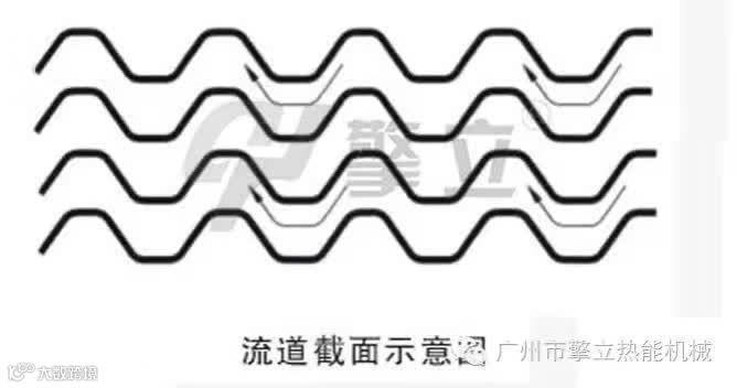 波纹板热交换器的整体热力结构是根据矩形板壳瓦楞扩展传热原理,采用流体非均匀湍动效应计算,传热板表面曲面系数有效地提高了流体运动中的传热要素—流体紊动率,减少流体边界层热阻和温度梯度,促使流体向全平面传递,从而强化传热效率。