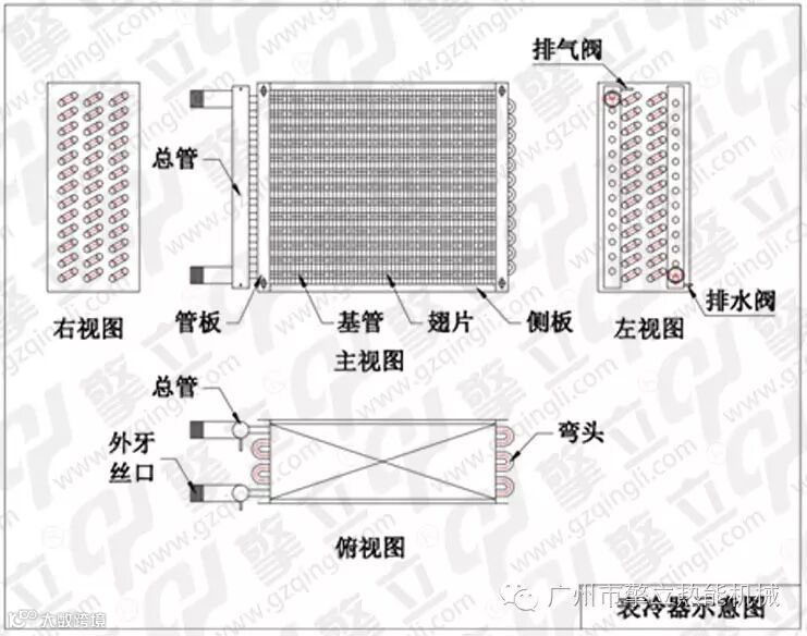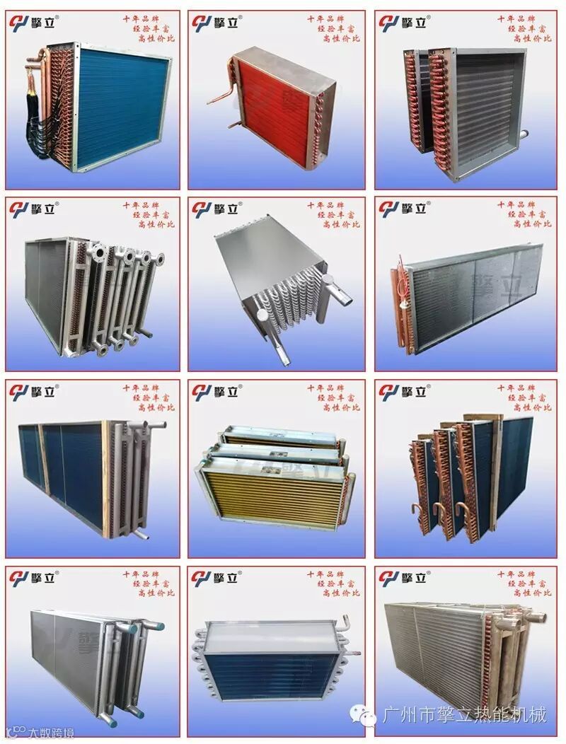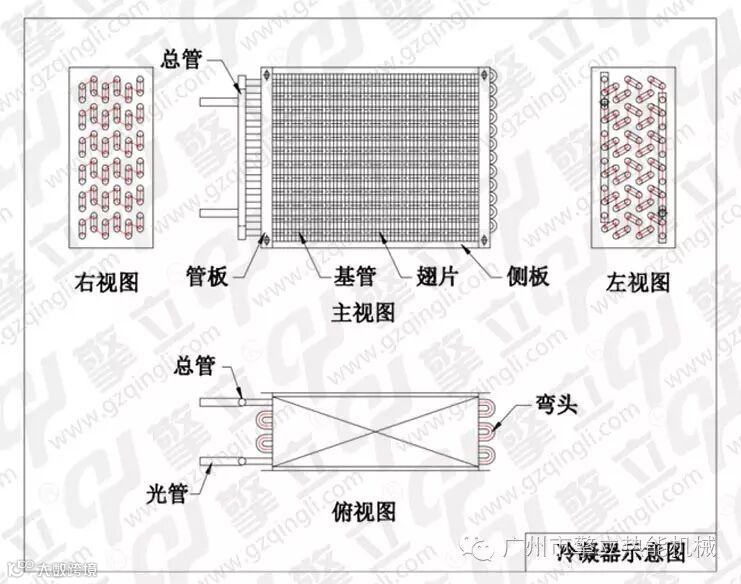 1、风冷式冷凝器:制冷剂的热量传到铜管,再传到铝箔,散热在空气中。