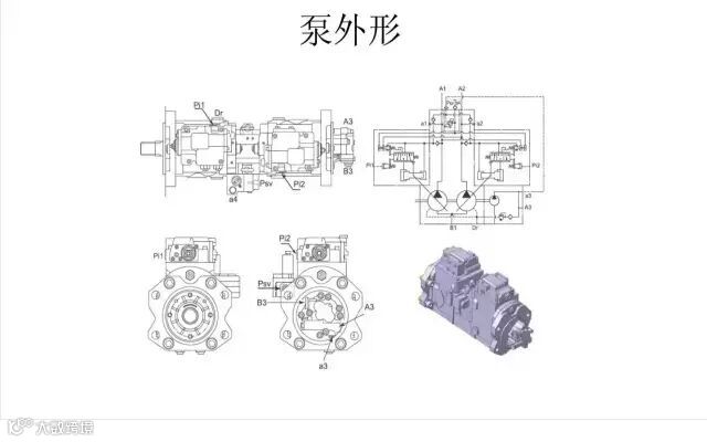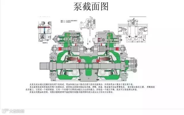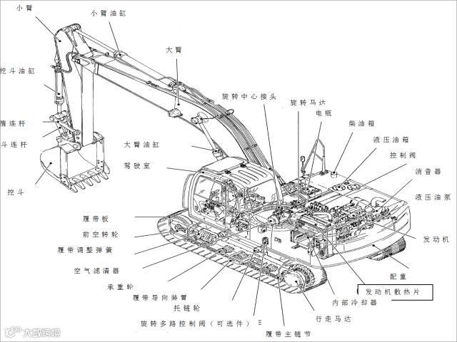 2、回转运动传输路线:柴油机——联轴节——液压泵(机械能转化为液压能)——分配阀——回转马达(液压能转化为机械能)——减速箱——回转支承——实现回转