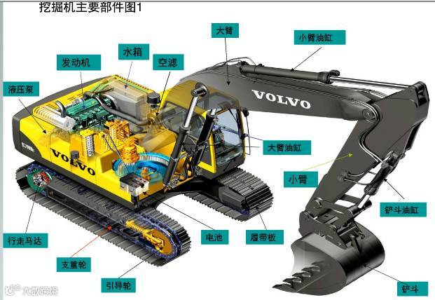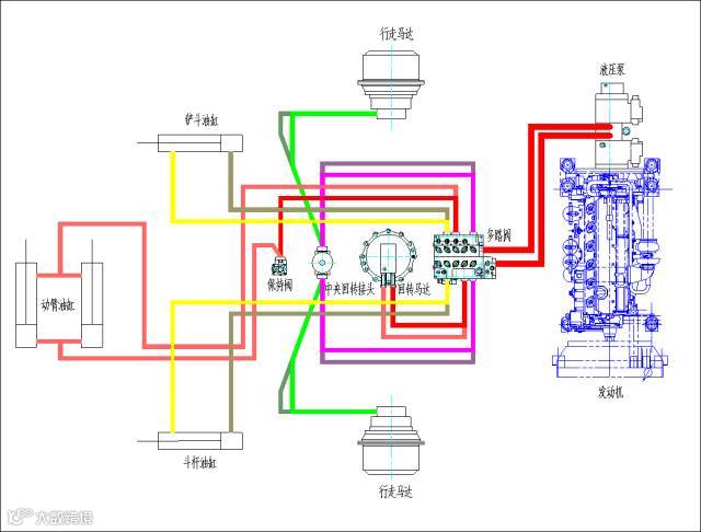 挖掘机的液压系统就是按照挖掘机工作装置和各个机构的传动要求,把各种液压元件用管路有机地连接起来的组合体。主要包含了液压油箱、主泵、多路阀、各管路及执行各动作的油缸、马达等部件。其功能是,以油液为工作介质,利用液压泵将发动机的机械能转变为液压能并进行传送,然后通过液压缸和液压马达等将液压能转返为机械能,实现挖掘机的各种动作。