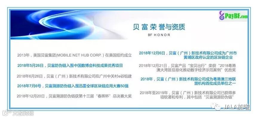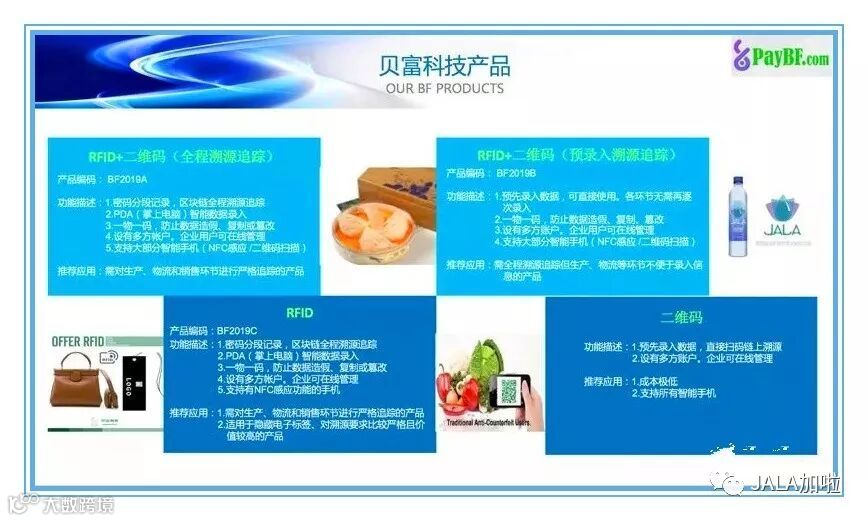 JALA为首个与区块链溯源技术合作的矿泉水品牌,JALA采用了贝富公司开发的贝富溯源防伪系统(Anti-counterfeit DApp Solution System),利用区块链的新技术,以低成本但高效的溯源防伪技术,做到每一个环节都有记录,且不能篡改,做到从生产、出厂、过关检验再到消费者手中都有所跟踪、记录,杜绝仿冒与劣质产品,让消费者买得放心,用得安心。