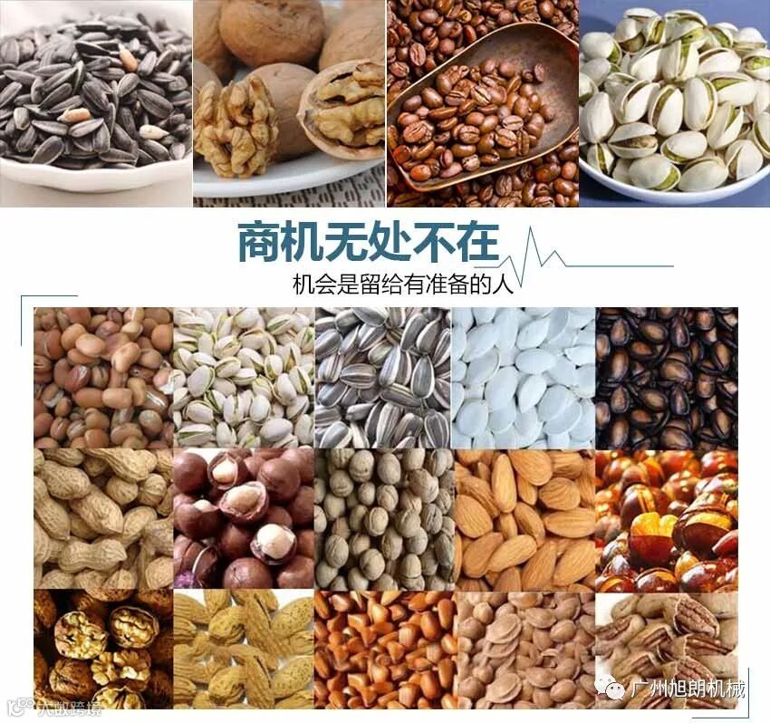 8.适合加工各种干果和坚果类,如;板栗、花生、瓜子、松籽、榛子、杏仁、菜籽、咖啡豆、红枣、芝麻、、核桃、各种豆类、麦类、米类等。适用于在食品加工厂、农贸市场、食品专卖店、连锁店等处定点加工和经营,符合生产、创业致富的需要。