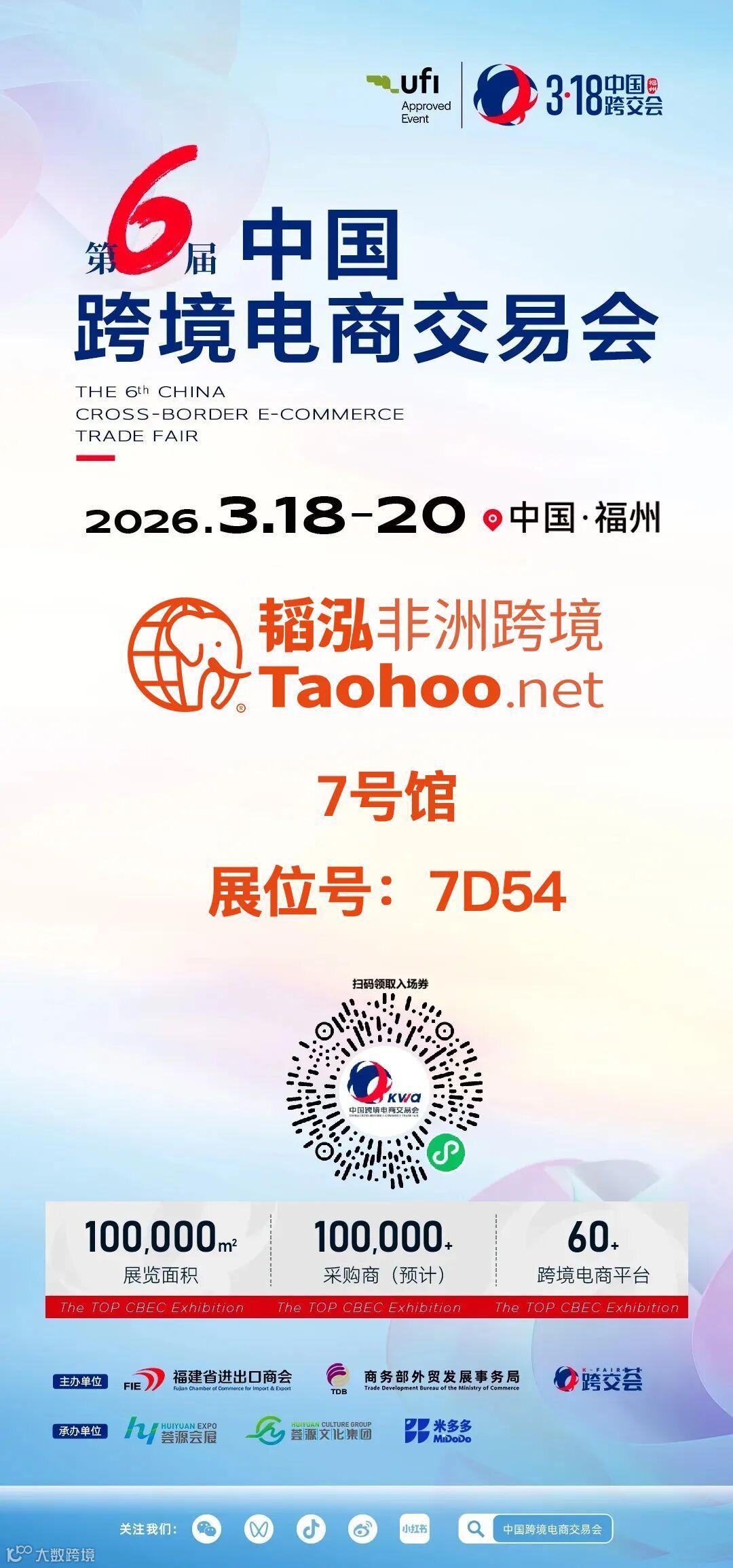 欢迎各位关注非洲的跨境卖家莅临7号馆7D54展位,在这里你可以看到第一手的中非电商市场信息,了解中非贸易的巨大潜力,我们致力于为中非跨境贸易双方提供更高效率、更低成本的跨境平台服务。