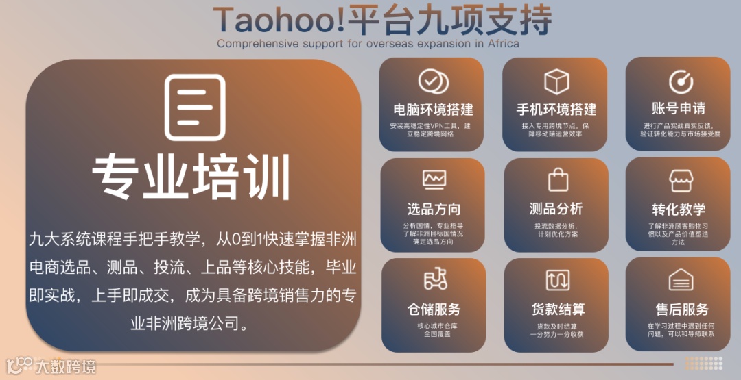 别让您的好产品困在国内仓库;别让您的野心止于会议室计划。和 Taohoo! 一起,明天就把样品送进非洲市场;下个月让订单飞向您的工厂;今年就把您的品牌刻进非洲消费者的心里,因为这片热土,从不辜负实干者。而我们,正等着陪您一起—— 在非洲市场赚下第一桶金,再赚下长久、稳定、滚烫的收益!
