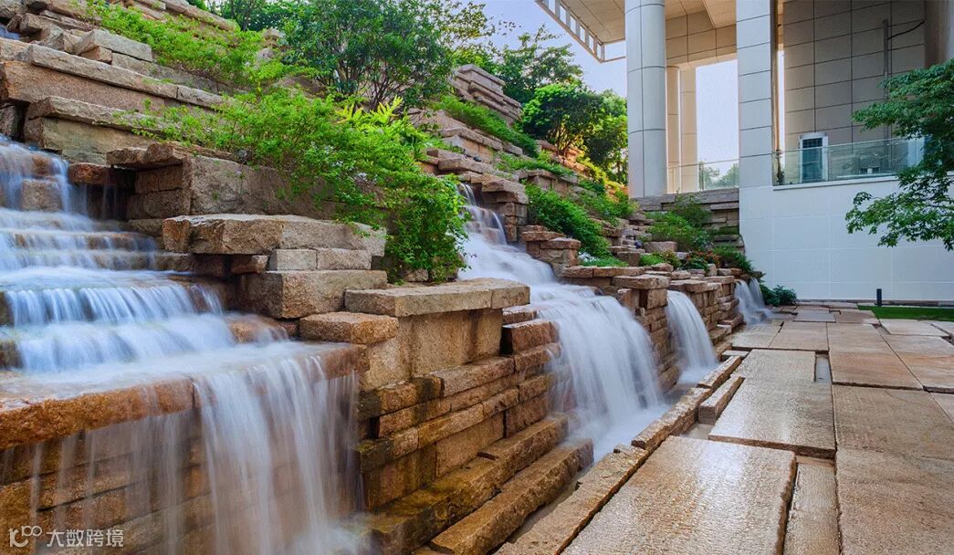 考虑到山与水的联结,设计出叠石瀑布。活水源源不断地从山头流淌而出,经过十几重石阶跌落,最终汇入水池,寓意生生不息。
