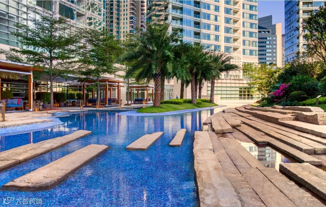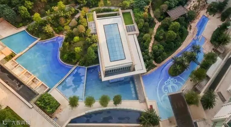 园林景观池,选择了从意大利原厂进口世界顶级马赛克。设计师现场量度,将每一块不同颜色的马赛克按色编号,再分色生产成品进行铺贴,才能形成如今一眼望去非常自然、有退晕效果的水景。