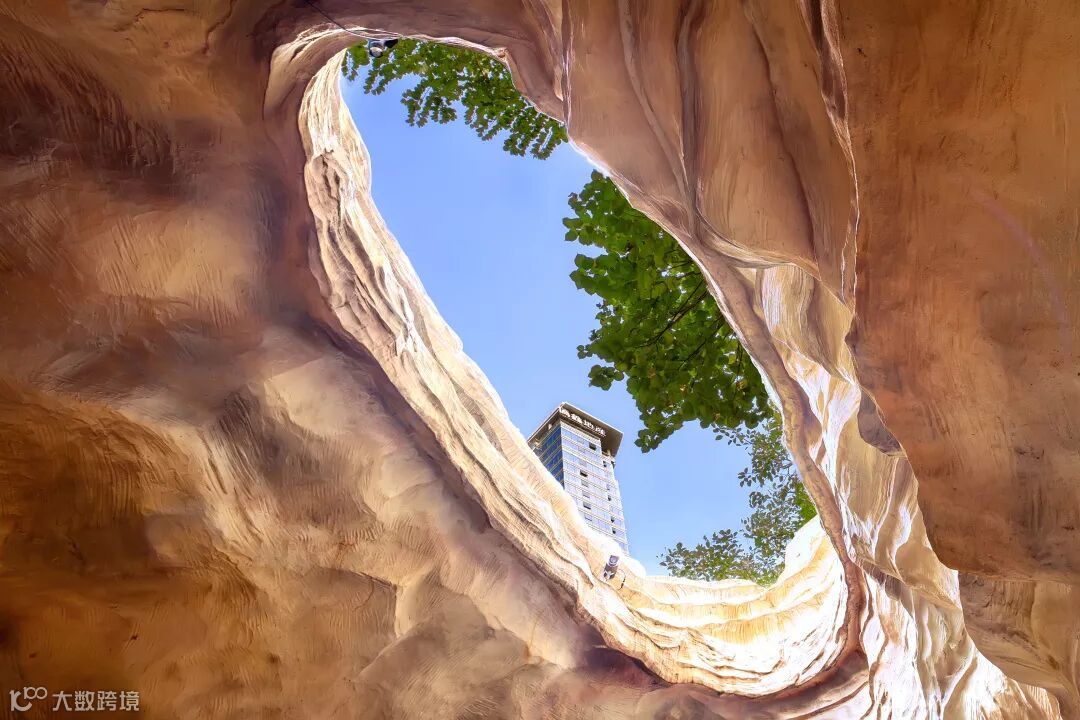园林建造的另一亮点,就是叠石瀑布后的溶洞。复刻美国羚羊谷的自然奇迹,洞穴内壁线条如波浪蜿蜒,时而空旷,时而隐蔽,曲折而去,变化多样。头顶溶洞天窗,晴天里洒下一米阳光,到了下雨天变成一个漏斗,近看雨水跌落成暗流,置身其中,感受自然奇妙。