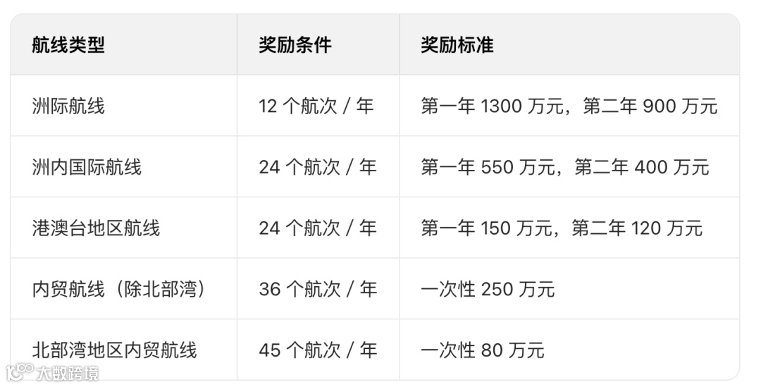 年度输送量 2 万 TEU(含)以上:250 万元 / 条 -