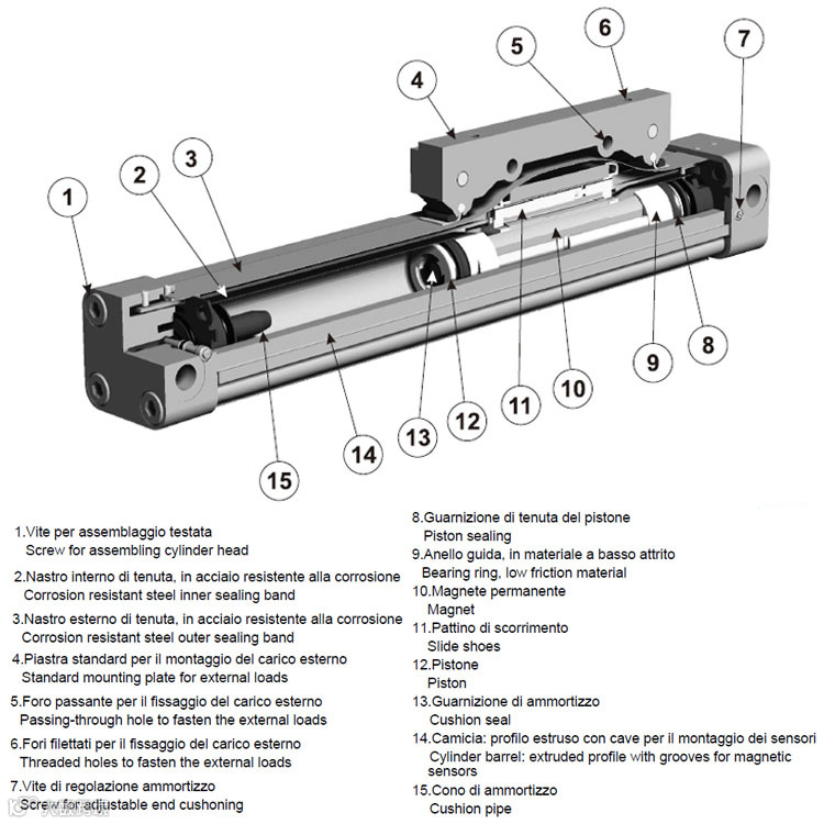 The cylinder is available in seven sizes: ø16; 25; 32; 40; 50; 63; 80.