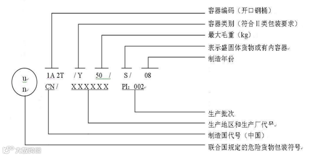 (a) 一个阿拉伯数字,表示包装的类型,1. 桶2. (暂缺)3. 罐4. 箱5. 袋6. 复合包装