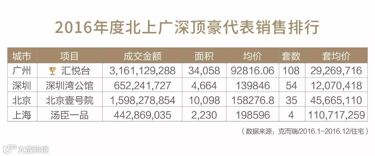 统计四城豪宅代表,2016年的总成交套数为201套,其中侨鑫•汇悦台成交108套,占据成交总套数的五成。成交总面积上,汇悦台远超北上深其他顶豪代表,超34000平方米,是第二名的3倍。而成交总额方面,汇悦台高达32个亿(网签数据因各种原因有所滞后,据知情人士透露,汇悦台2016年销售达60亿)。