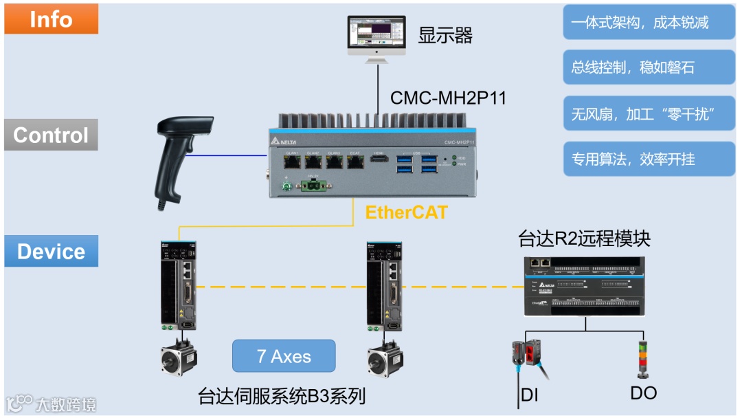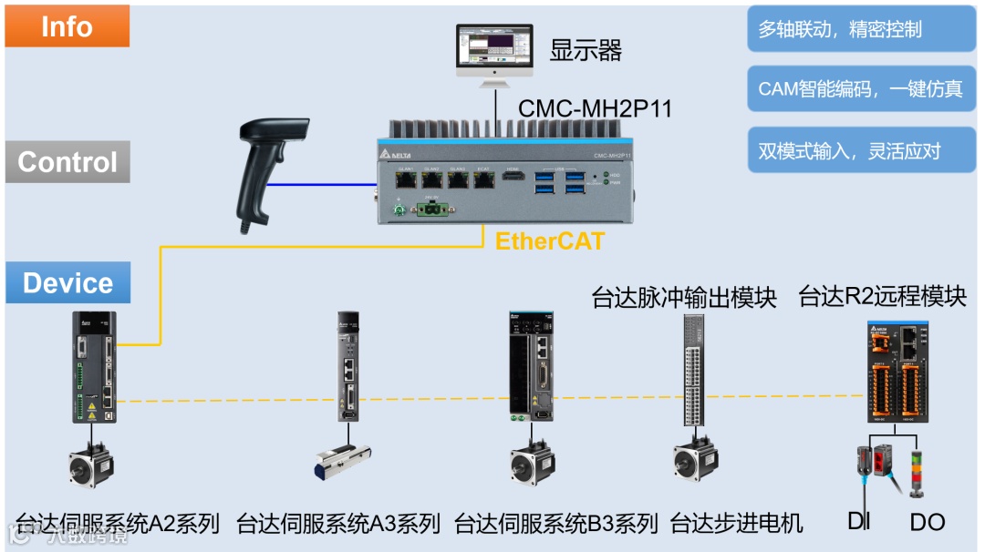 工业自动化领域中,设备集成度低、布线复杂、维护成本高、定制周期长等问题,一直是制约高效生产的痛点。台达全新推出的CMC-MH2P11一体式运动控制器,为半导体、3C制造、木工机械、智能装备等领域提供了 “小体积、大能量” 的解决方案,重新定义了多轴控制的未来。