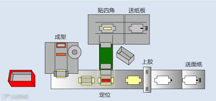 定位:将上胶后的面纸盒贴好四角的坯盒定位