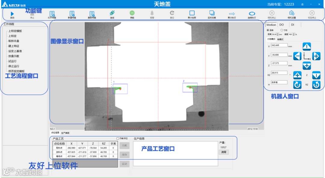 台达自研PC-based 天地盖系统应用软件,整合台达机器人,台达视觉和工艺场景于一体,为客户提供一站式的天地盖控制系统。