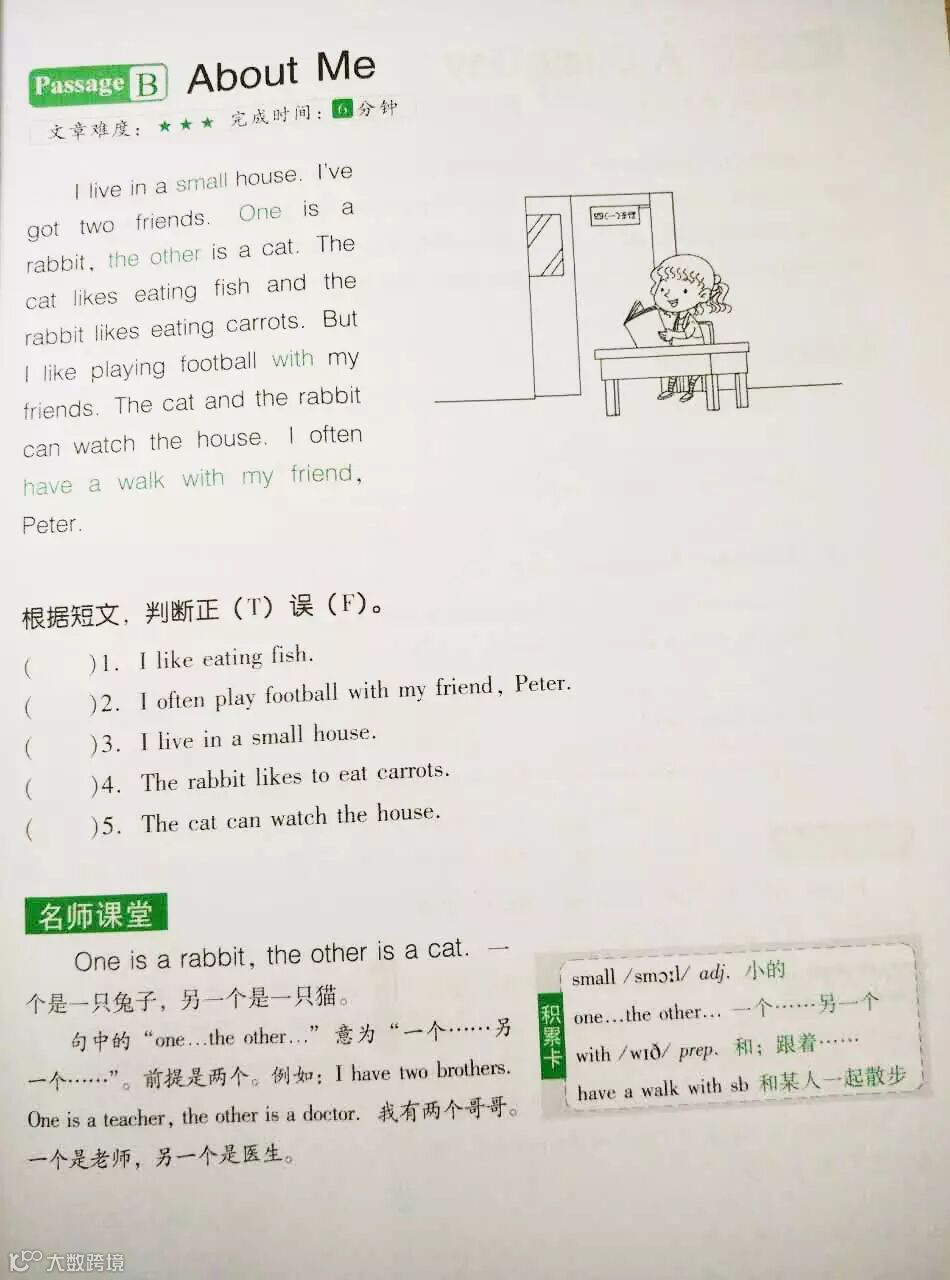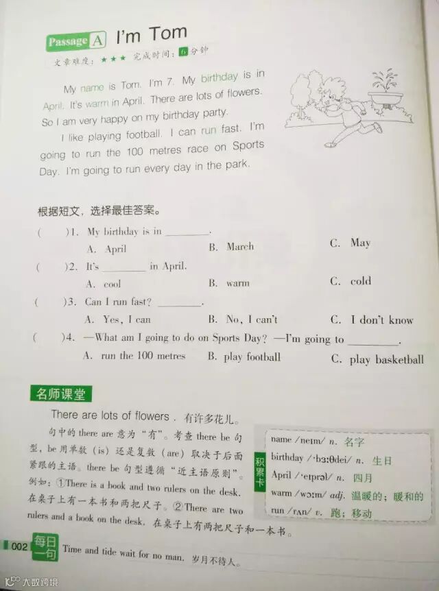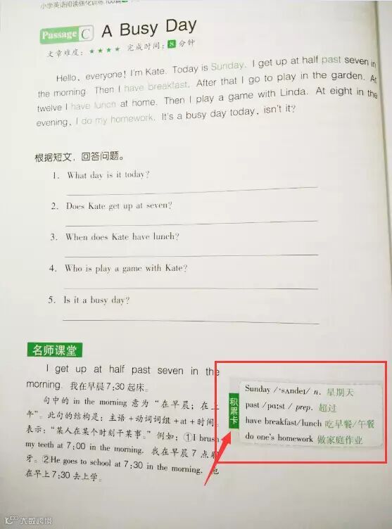 “积累卡”,精析材料中的重点单词、短语;“名师讲堂”,从实例中解析语法知识;“每日一句”,经典名言、谚语大展览。从英语学习词汇、语法到句子,学生全方位积累英语素材,拓展知识面。