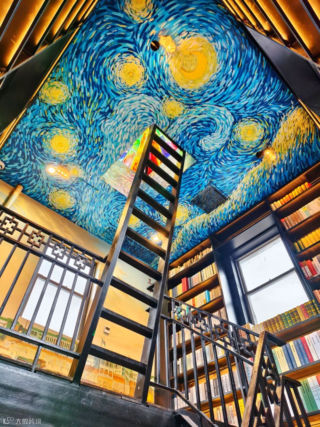 灯塔顶部是梵高的星空手绘图和彩色玻璃窗,意味着人们从历史走向未来。