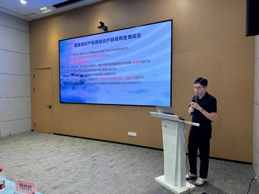 最后,北京集佳知识产权代理有限公司广州分公司项目咨询师宋麒宣讲《知识产权领域信用相关规定》,详细讲解了国家知识产权局知识产权信用管理规定相关条例、失信行为影响以及信用修复的相关知识。