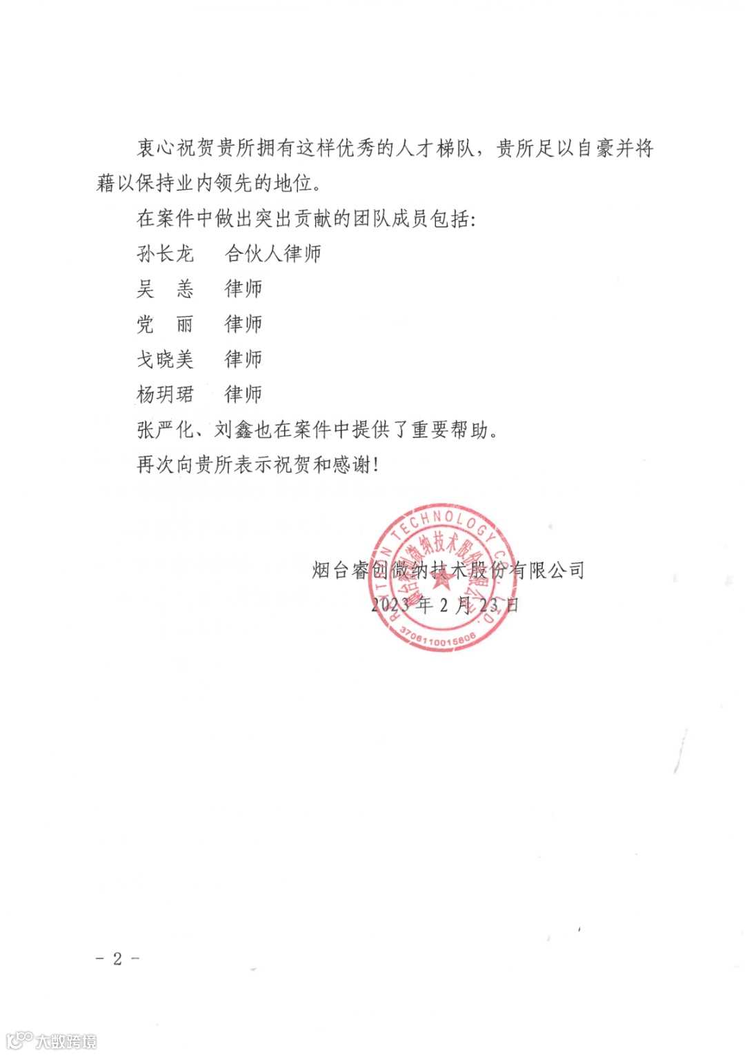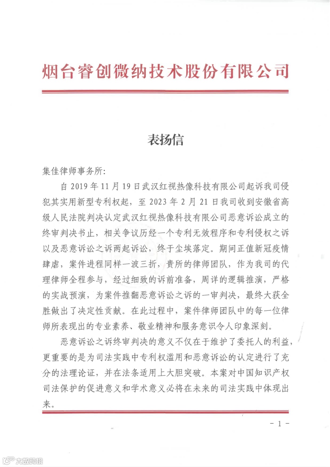 睿创集团向集佳律所寄送的表扬信
