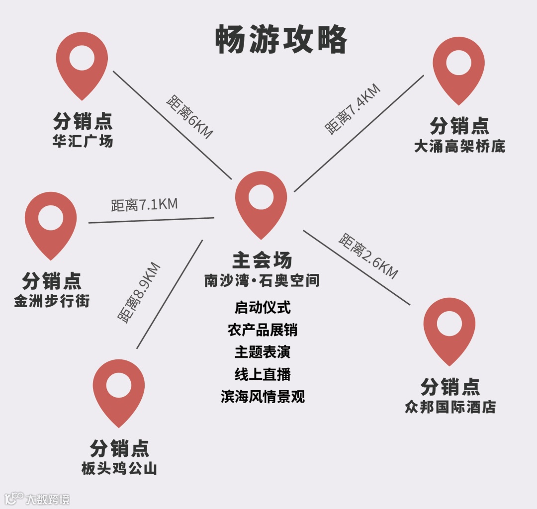 活动以“线上+线下”、“主会场+分销点”形式进行。主会场(南沙湾·石奥空间)、分销点(华汇广场、金州商业街、板头鸡公山入口、大涌桥底(茗荔园门口)、众邦国际酒店对面公交车站)。