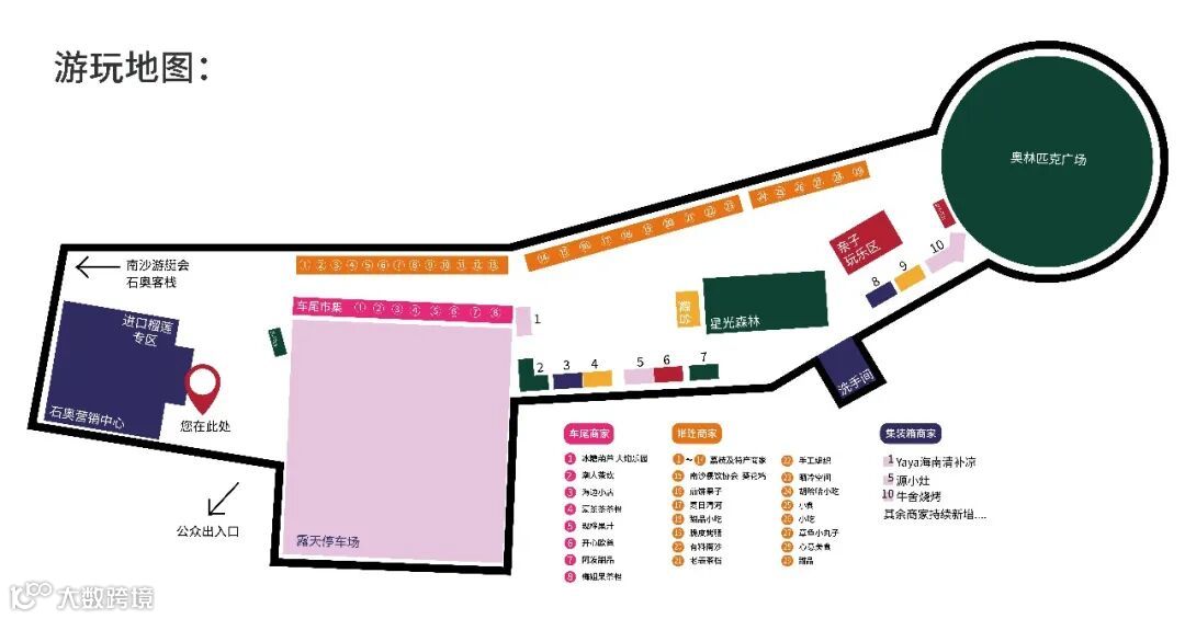 主会场(南沙湾·石奥空间)活动从6月16日-25日,共持续十天。设置了车尾箱市集摊位、花车摊位、进出口水果摊位,包括启动仪式、农产品展销、主题表演、线上直播等几大部分。