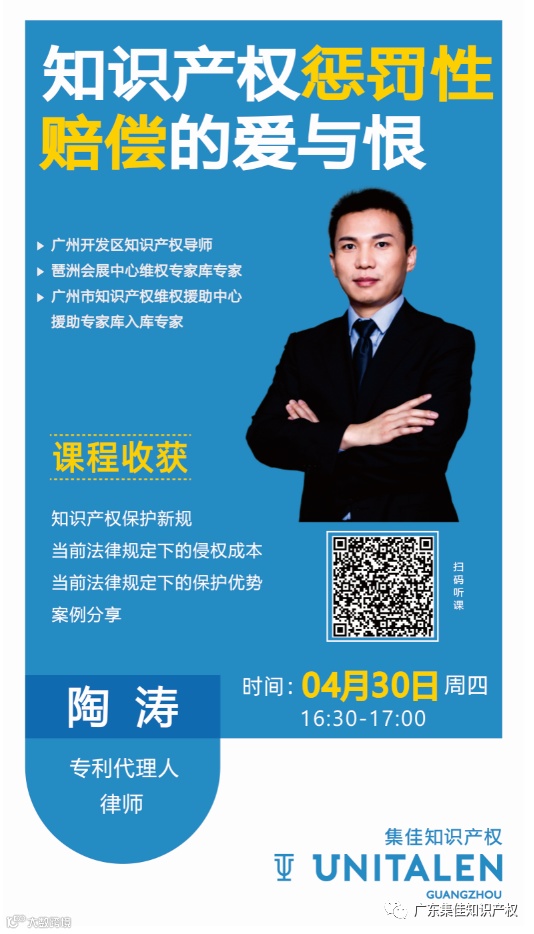 导读:4月30日(周四)下午4:30,集佳知识产权直播课堂将进行《知识产权惩罚性赔偿的爱与恨》的在线直播,由资深律师、专利代理师陶涛主讲。欢迎大家扫码观看!