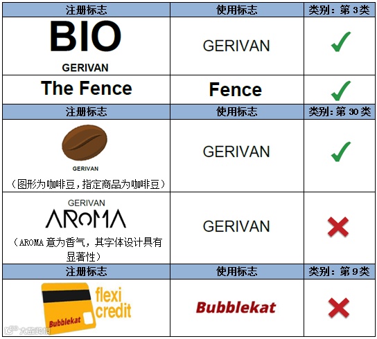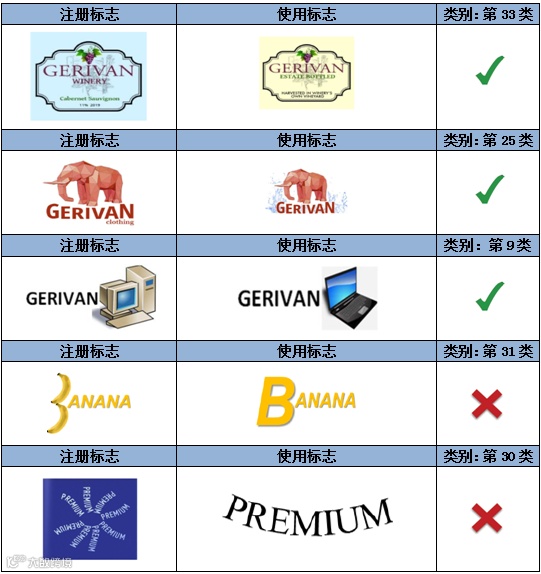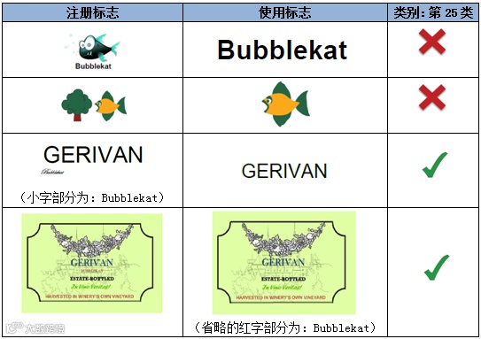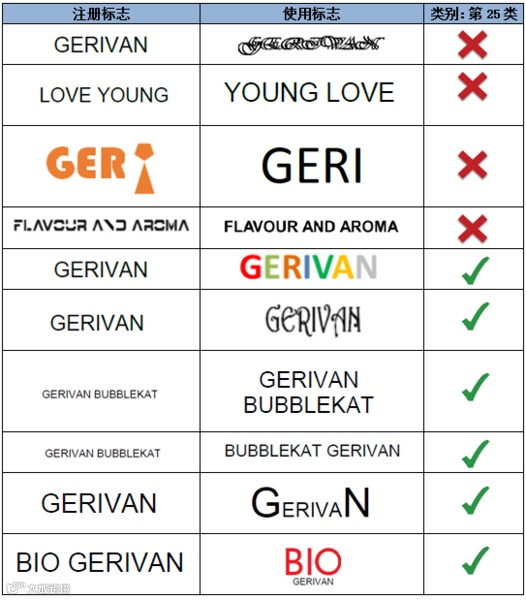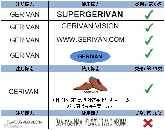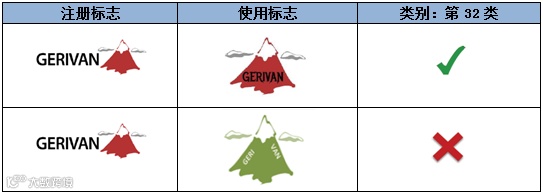 如上述示例,注册商标指定在第32类矿泉水商品上,相较而言,图形对指定商品具有一定暗示性,而显著性较弱。因此,文字部分“GERIVAN”为该注册商标的主要显著部分。第一组中的使用标志仅是对图形和文字的位置进行了调整,不影响文字部分的显著性。而第二组的使用标志对文字进行了拆分,形成了新的商业印象,故视为实质变更。