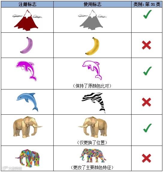 需要留意的是,对于黑白商标和彩色商标,更换颜色(如黑白更换为彩色,或彩色更换为黑白),与国内的判断标准稍有不同。根据本指南,颜色更改是否构成注册标志的实质变更,判断标准仍主要取决于是否对注册标志的显著要素构成更改,换句话说,“颜色”是否为该注册标志的显著要素。如上述示例七中第二组,指定商品为第31类“香蕉”,因此,该注册标志中的“粉色”为该注册商标的主要显著部分,更改为其他颜色则构成实质变更,而如上述示例七中的第一、三组,颜色并非注册商标的主要显著部分,则可以在使用中更换标志的颜色。