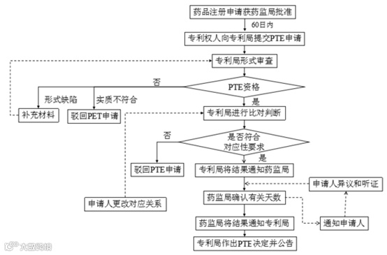 1)PTE申请人(专利权人)在收到药监局上市批准的规定时限内(例如60日)向专利局提交PTE申请;