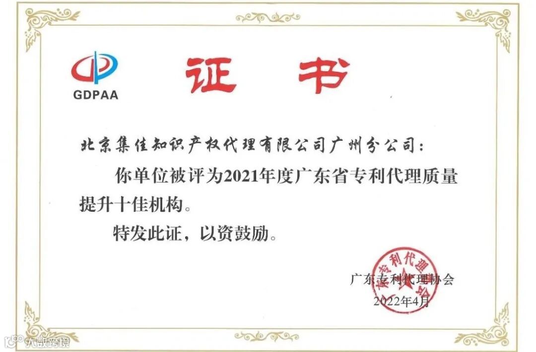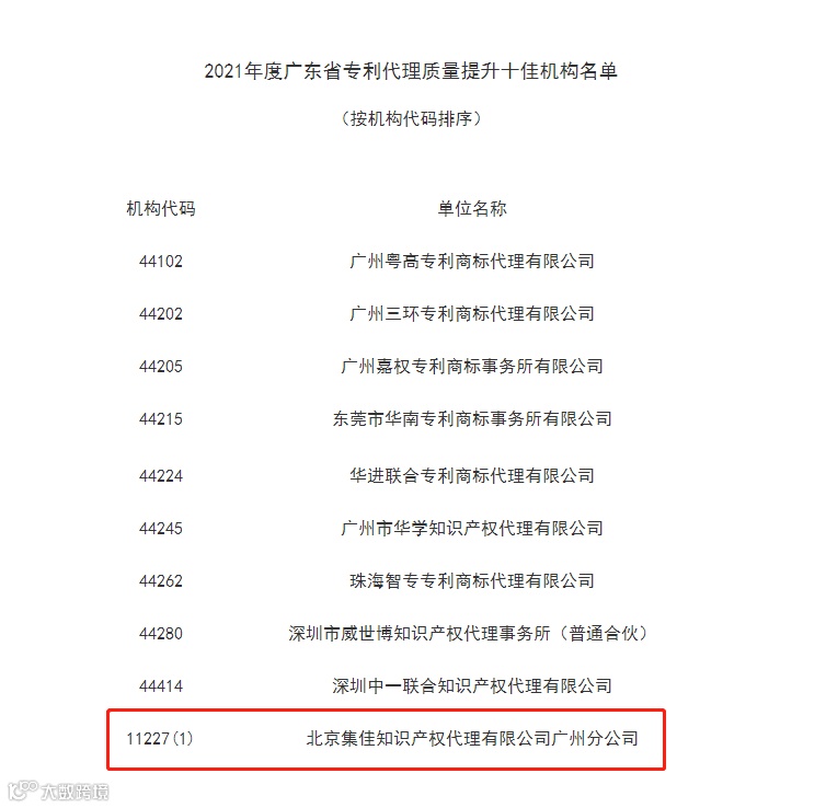 北京集佳知识产权代理有限公司广州分公司在省内众多优秀代理机构中脱颖而出,获评的“十佳机构”。